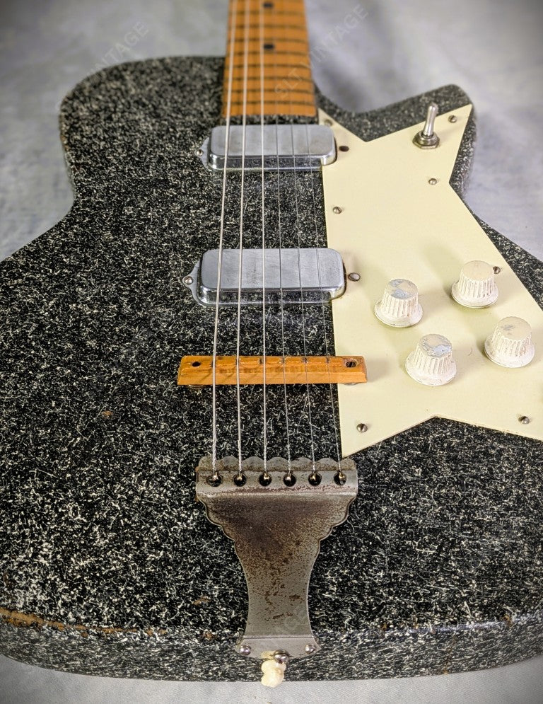 One of the craziest finishes ever implemented on a guitar and similar to asphalt! These Sizzlers are easy to play and sound amazing thanks to the thin body and maple fingerboard! This guitar is 100% Factory Stock! Features include; PRO Full 25 3/4” Scale; Highly Resonant Maple Slab Neck-Through Design; 6lbs; L-37”, D-1 1/2”, W- (lower bout) 13 7/8”; 1 5/8” Bone Nut; 2” at 12th; Kluson Deluxe Tuners; Maple Fingerboard on a Slightly Flattened Medium C Neck .893” 1st Fret, 1.270” 12th; .088” Fret Wire; Compensating Maple Bridge; TWO Gorgeous Sounding Kay Pancake Pickup sporting 6k Output; Stunning Plextone Finish with Black Lacquered Neck; K-Shaped Signature Pickguard.